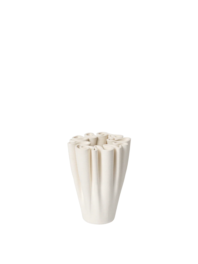 This smaller variation of the Dedali Vase echoes the elaborate patterns of a 'Dédales' or labyrinth, offering the same fusion of art and utility in an updated form. Crafted from 3D-printed ceramic, its intricate labyrinth-like top is both visually striking and functional, perfect for arranging small floral displays in a voluminous, Ikebana-inspired style.