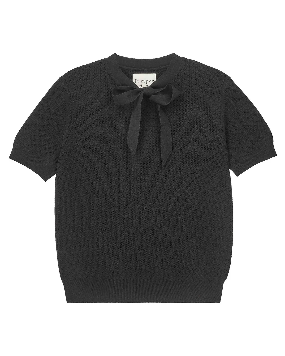 Jumper 1234 merino wool jumper. Black pointelle merino short sleeve jumper with a tie bow. A great jumper for the evening, and obviously also for the day! It's true to size and comes in 'macaroon' too.