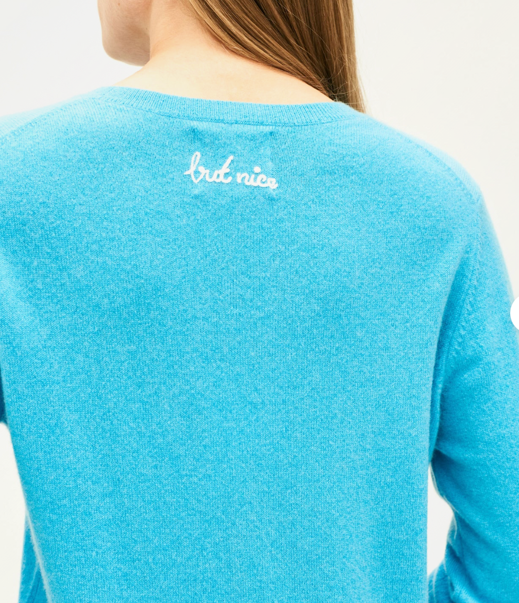Have you been naughty or nice this year? This Jumper 1234 Mint Blue cashmere jumper features ‘naughty’ embroidered on the chest and ‘but nice’ on the back in white chain stitch … a cheeky, festive twist on a luxury knit.