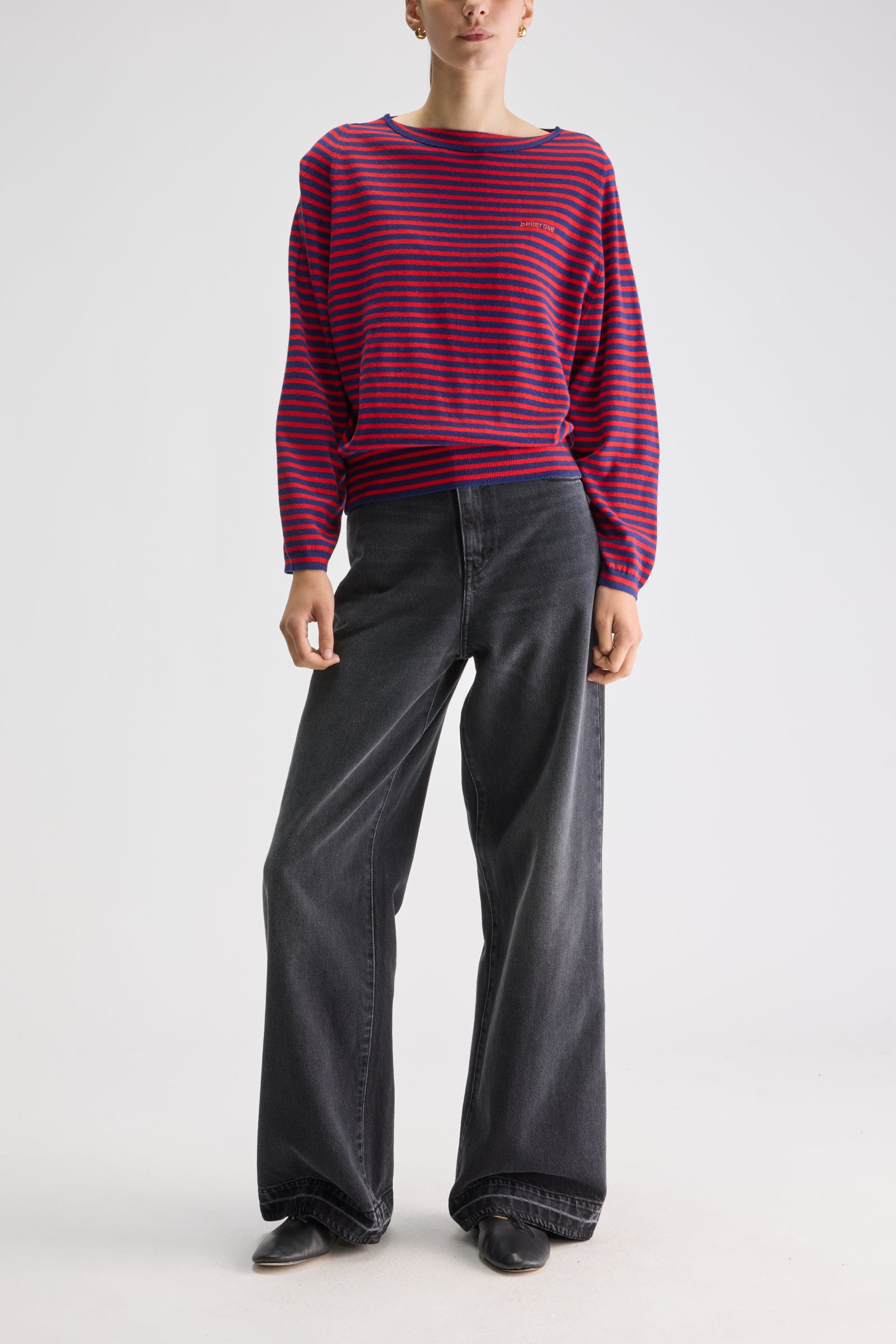 Relaxed long-sleeve fine-gauge knit sweater with red and navy stripes and a boat neck.