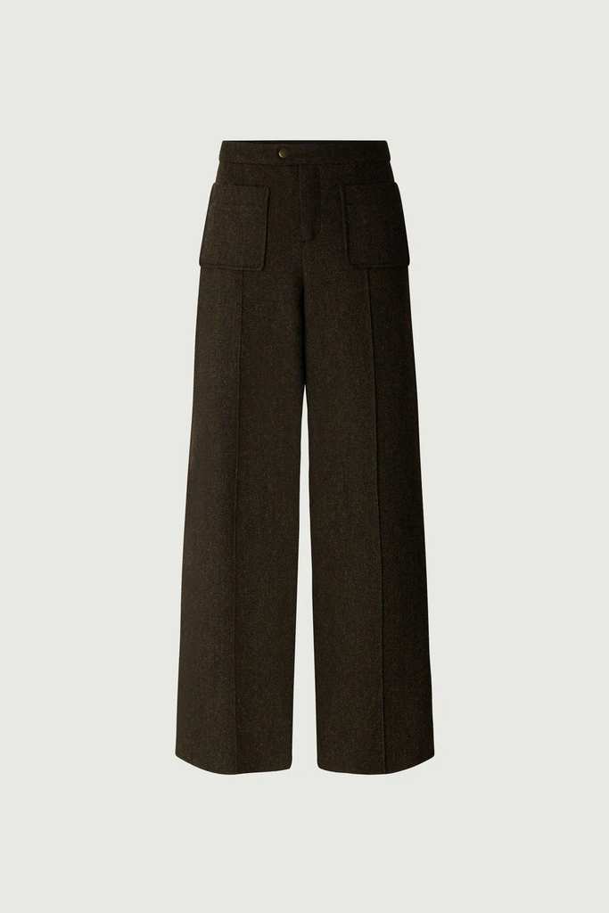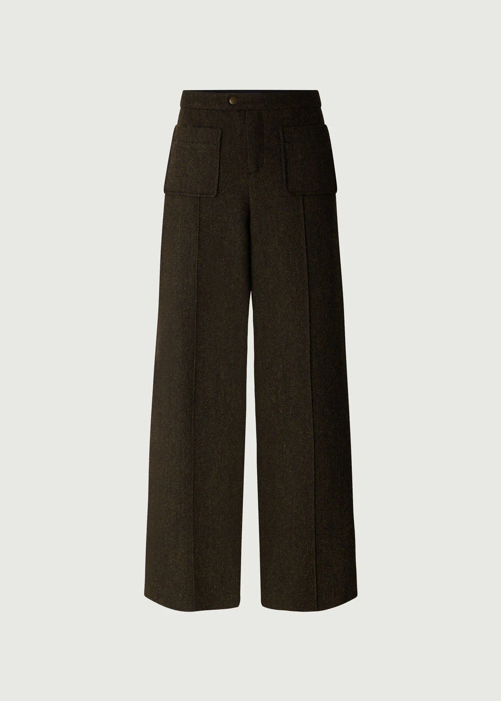 Regular fit, high rise, two patch pockets at front, straight leg, slightly flared leg, all-over herringbone weave, centre seams to front and back, two patch pockets at back